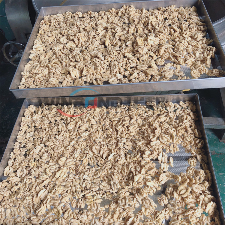 核桃仁去皮清洗機的主要作用是利用高壓水流沖洗掉核桃仁表面的皮衣,因為核桃仁表皮發澀,口感不好,