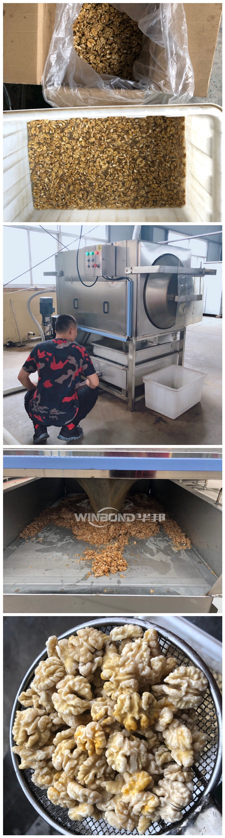 3.核桃仁在清洗機內(nèi)清洗掉沒有完全脫離的少量浮皮,重點是清洗一遍,顏色更加好看。(這一步可根據(jù)客戶的工藝來選擇是否需要。)