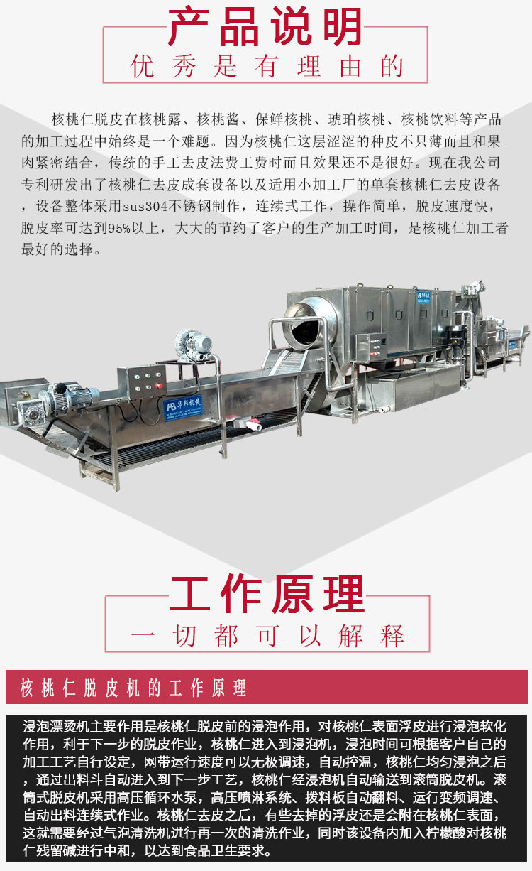 核桃仁營養豐富,具有健腦補腦的作用,有效的防止細胞老化,增強記憶力,老少皆宜,孕婦都能食用。但核桃仁內衣發苦發澀,而且不好去除,生產出來的產品口感不好,諸城華邦機械有限公司研發的純物理核桃仁去皮機,技術成熟,去皮效率高,循環水設計,節水節能,適合品種的核桃。
