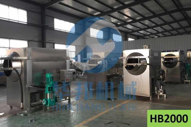 使用全自動輸送機,輸送到脫皮機內,然后采用高壓循環水泵,高壓噴淋系統,變頻調速、自動翻料、自動出料!